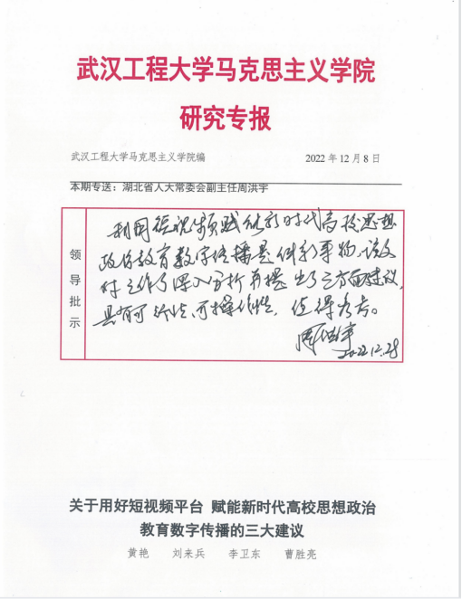 (通讯员:马嘉蔚、吴梦云)2022年12月28日,,,,,,由我校JDB电子官网黄艳教授执笔的钻研专报《关于用好短视频平台赋能新时期高校思想政治教育数字传布的三大建议》受到湖北省人大常委会副主任周洪宇的高度注定并作出批示。。。。。。。。