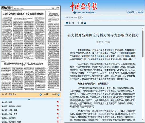 (通讯员 兰洁 赵文)2024年1月18日,,,,, ,,,JDB电子官网曹胜亮教授、兰洁博士在《中国教育报》(理论版)颁发了一篇题为《着力提升新闻舆论传布力疏导力影响力公信力》的文章。。。。。文章深刻论述了新时期布景下,,,,, ,,,若何贯彻落实习近平文化思想,,,,, ,,,提高新闻舆论的传布力、疏导力、影响力和公信力。。。。。